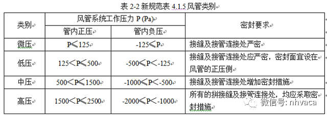 其次,风管类别本次修编补充了负压的规定,比原规范更细化,容易操作,详见表2-2,即新规范风管类别表 4.1.5。对于各类风管的负压和高压风管的最高压也作出了限定,也就是不再开口,使规范对风管类别规定更加严密。