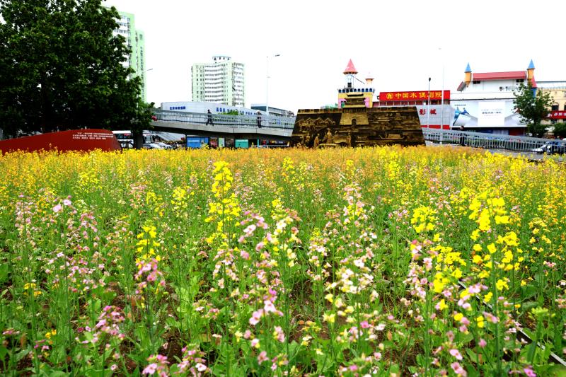 安贞拾光主题广场1500平方米的五彩油菜花陆续绽放,为都市增添田园风光。史超齐 摄