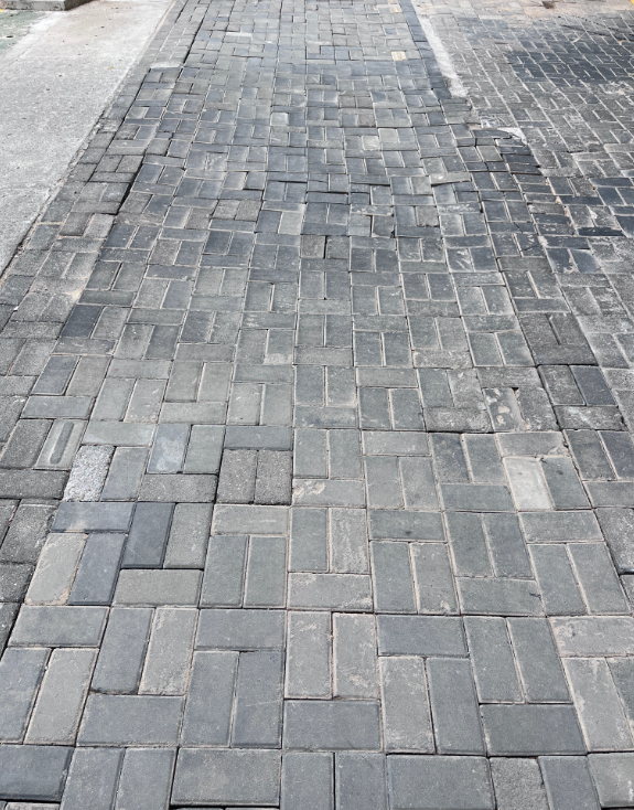 居民楼门口的保安也表示,道路翻修,重新铺上的石砖地比较粗糙,经常听见老人们经常抱怨“路不平”“难走”“怕摔跤”。附近一美甲店的员工称,上周一位顾客进门时险些摔倒。