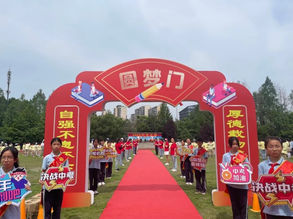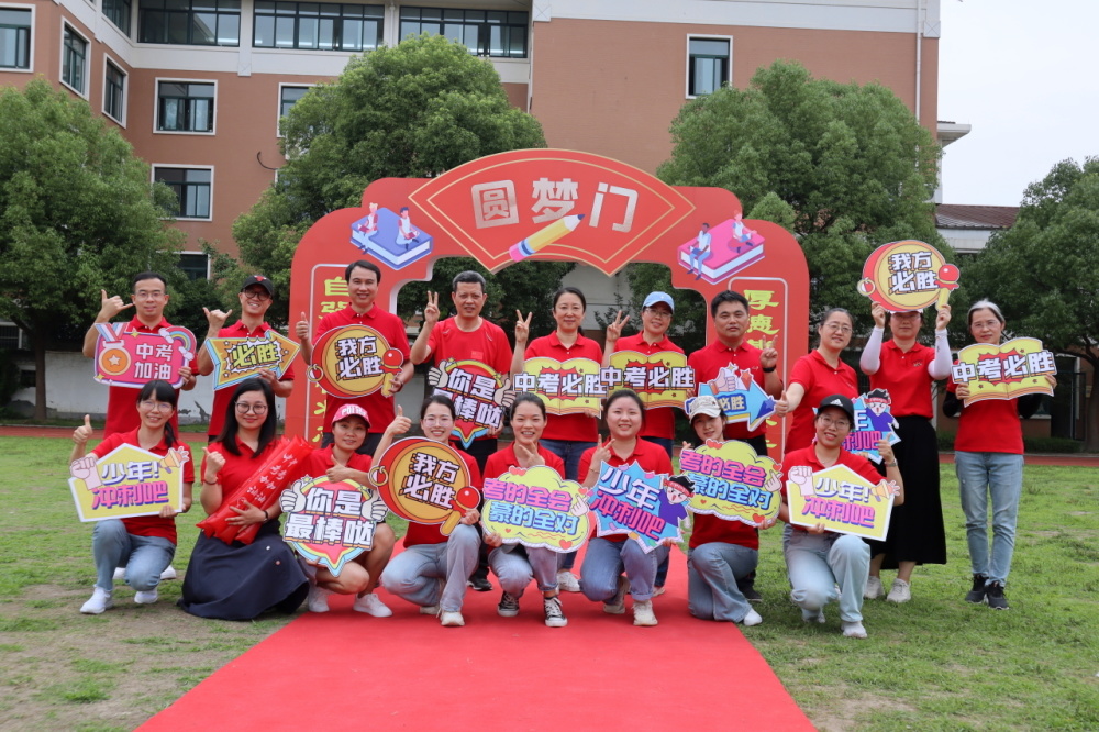 伴随着“状元鼓”的鼓点,在全校师生的掌声与欢呼声中,全体九年级同学走上红毯,穿过圆梦门,来到操场,与夹道加油的老师们一一击掌。