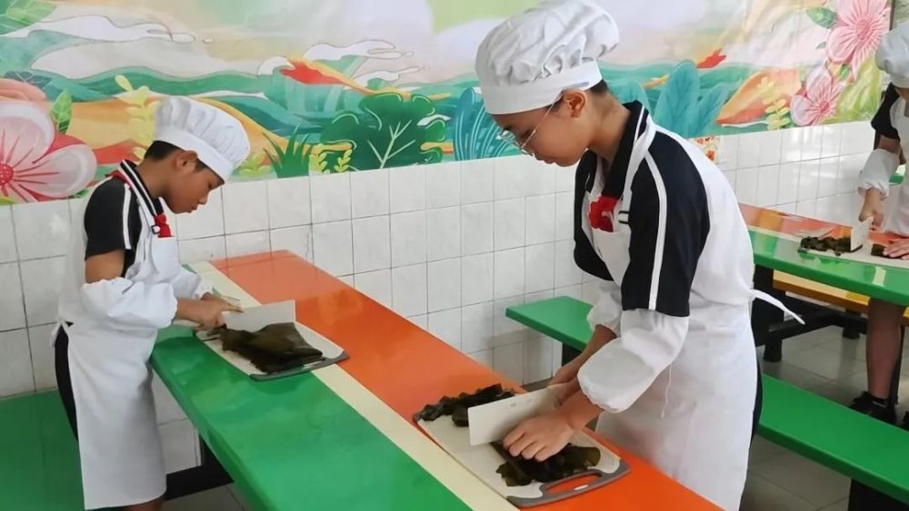 活动上,学生们在食堂厨师们的指导下,认真进行着洗切海带、清洗绿豆、酿苦瓜等工序,细心为此次端午主题菜式烹饪准备好食材。同时,学生们也现场品尝了由饭堂厨师们精心制作的绿豆汤,在端午节到来之际,品尝到了一道具有清热消暑功能的广式甜品。