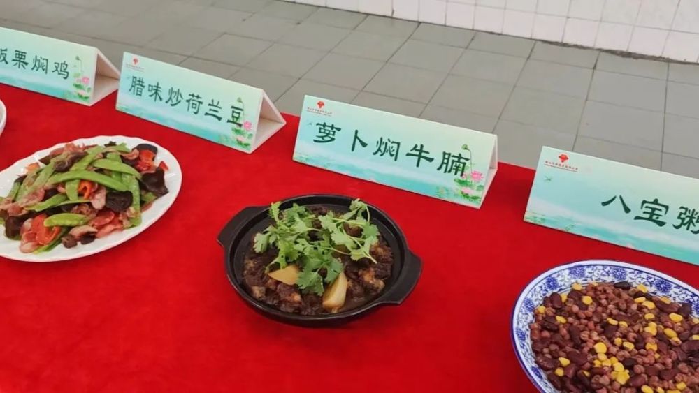 活动现场,学生们还向大家展示了二十四节气对应的24道菜式,春分主题的芦笋炒虾仁、夏至主题的蒜香红苋菜、立秋主题的莲藕排骨汤、冬至主题的八宝粥......每一道菜式都使用当季最新鲜食材制作,具备应季的饮食功效,可谓美味与健康兼具,颜值与文化并存。
