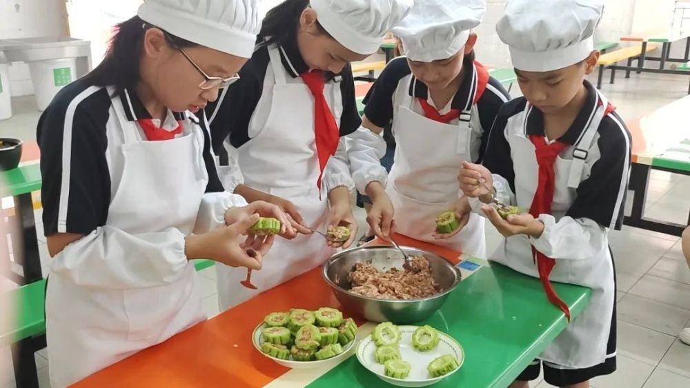切海带、酿苦瓜、品尝清热消暑的绿豆汤......6月21日上午,乐从红棉小学食堂内,一场特别的“烹饪课”正在举行,来自各年级的学生们在食堂师傅和老师的指导下,认真地进行着两道应季菜式——绿豆汤、酿苦瓜的备料工作。
