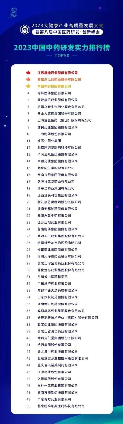 2023中国中药研发实力50强排行榜发布 6月29日,2023大健康产业高质量发展大会暨第八届中国医药研发创新峰会在重庆举行,会上发布了“2023中国中药研发实力排行榜”榜单。江苏康缘药业股份有限公司、石家庄以岭药业股份有限公司、中国中药控股有限公司排名前三。