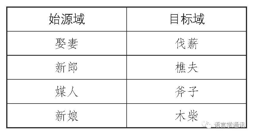 这里娶妻被比作伐薪:伐薪必须用斧子, 娶妻必须通过媒人。[娶妻是伐薪]所蕴含的隐喻映射可概括如下: