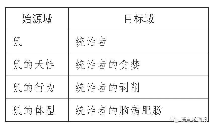 上面是《硕鼠》第一章, 将统治者比作剥削百姓的大老鼠, 以突显其贪婪和无情。这一隐喻所激活的映射很丰富, 如下: