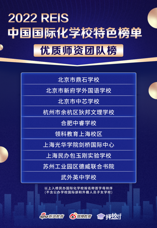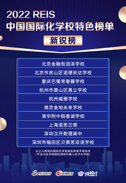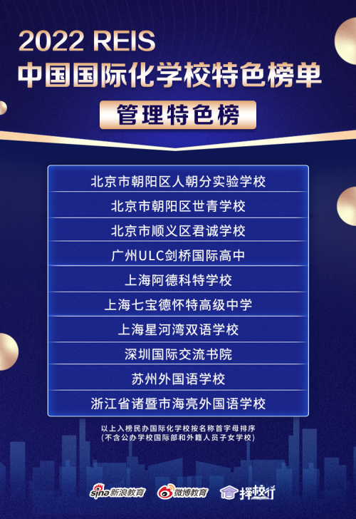 “2022 REIS·中国国际化学校特色榜单”由新浪教育、微博教育、择校行联合推出,从学校特色管理、学校特色师资、学校特色课程、新锐办学等四个维度遴选出本年度优质的民办国际化学校,全国40所民办国际化学校入榜(不含公办学校国际部和外籍人员子女学校),地域覆盖北京、上海、广东、浙江、江苏、成都等全国12个省/市。