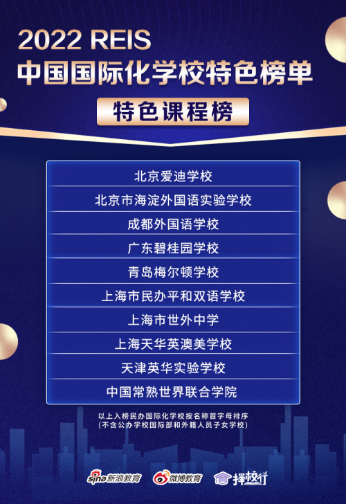 《REIS·中国国际化学校特色课程榜》评选出在特色课程方面教学优异的民办国际化学校。特色课程体现了学校对学生培养的针对性、定制性、综合性的特点,它能综合培养出学生的兴趣爱好及技能。