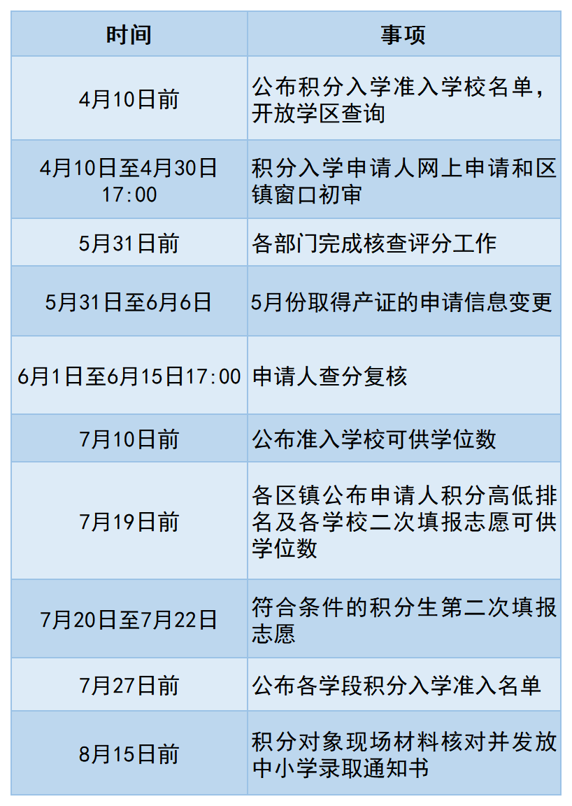 第八条??新市民子女积分入学实行政策公开、程序公开、结果公开,主动接受社会各界的监督。4月10日前公布当年度准入学校和学区;7月10日前公布准入学校可供学位数;7月19日前公布各区镇申请人积分高低排名及各学校二次填报志愿可供学位数;7月27日前公布各学段准入名单。以上信息均在昆山市人民网(www.ks.gov.cn)公布。