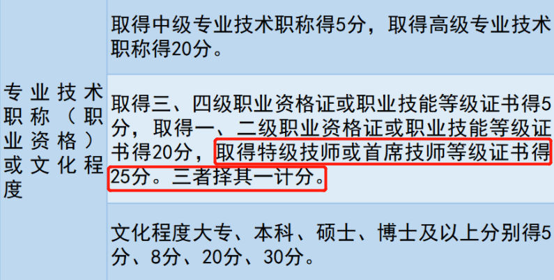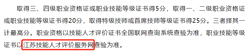 取得三、四级职业资格证或职业技能等级证书得5分,取得一、二级职业资格证或职业技能等级证书得20分,取得特级技师或首席技师等级证书得25分。三者择其一计最高分。职业资格以技能人才评价证书全国联网查询系统查验为准,职业技能等级证书以江苏技能人才评价服务网查验为准。