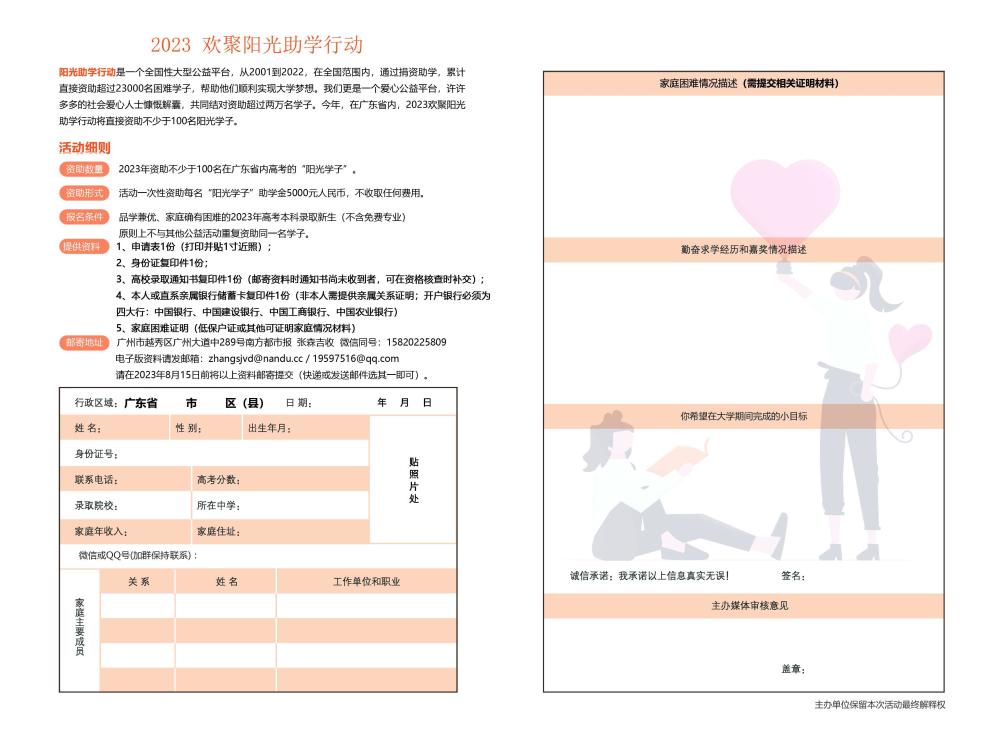 今年,为了帮助更多的学子圆梦大学, 2023欢聚阳光助学行动将继续直接资助不少于100名广东困难大学新生,每名新生将获得5000元人民币,本次活动不收取任何费用。