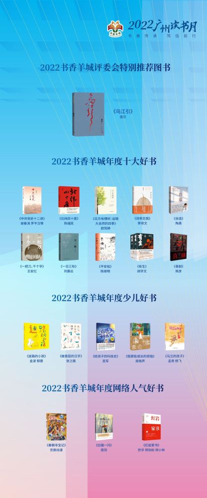 《乌江引》《一把刀,千个字》《北纬四十度》等19种好书,分别获评“2022书香羊城评委会特别推荐图书”“2022书香羊城年度十大好书”等4项大奖。