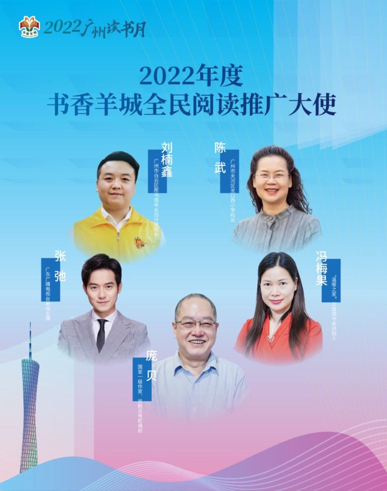 广州市龙口西小学校长陈武、著名作家庞贝、公益阅读项目发起人刘楠鑫、公益读书会创始人冯梅果、广东广播电视台主播张弛五人成为今年的新“全民阅读推广大使”。