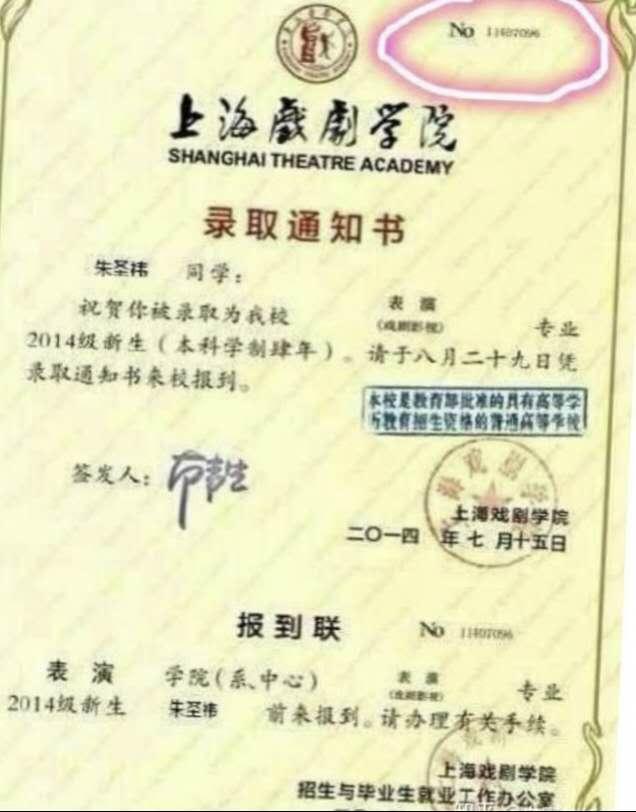 不过朱圣祎再接再厉,又发了上戏给她的录取通知书,用来证实自己是名正言顺被录取的。