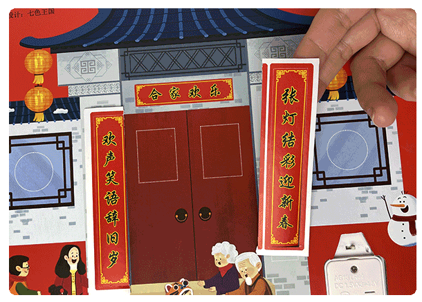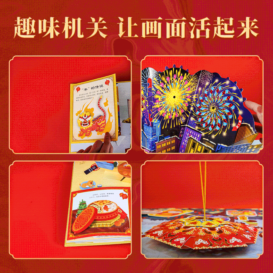 不仅如此,孩子翻开书,还能听到过年时的烟花鞭炮声、拜年吉祥话儿、看到热闹的舞龙舞狮、元宵灯会等。最有趣的是,这些场景都是活的,用手轻轻一拉、一按,整个画面都活了起来。