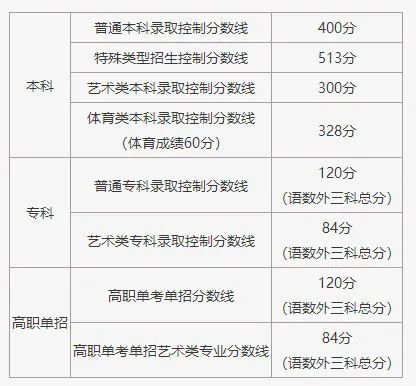 第一批录取院校本科最低录取控制分数线:487分;第二批录取院校本科填报志愿资格线410分;高职(专科)填报志愿资格线:150分。