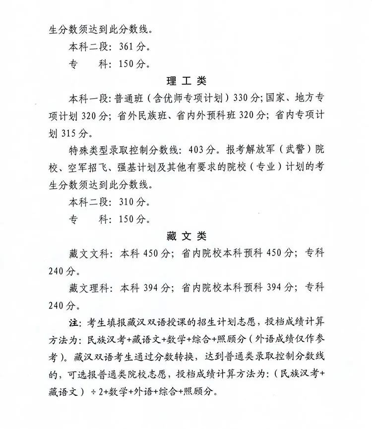 第一批录取院校本科最低录取控制分数线:412分;第二批录取院校本科填报志愿资格线:345分;高职(专科)填报志愿资格线:150分。