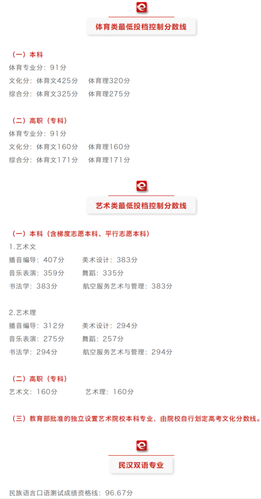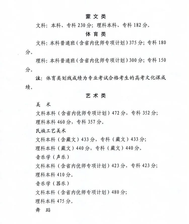 其他艺术类特殊专业文化线按教育部《普通高等学校本科专业目录(2020年版)》及新增专业目录所对应的专业类文化线执行。