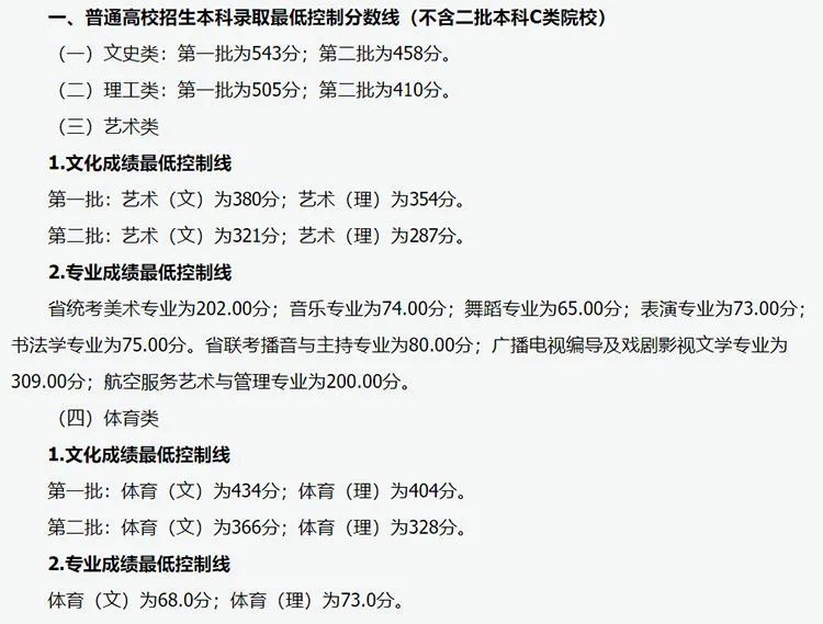 第一批录取院校文科本科最低录取控制分数线:505分;第一批录取院校理科本科最低录取控制分数线:412分;第二批录取院校文科本科填报志愿资格线:430分;第二批录取院校理科本科填报志愿资格线:345分。
