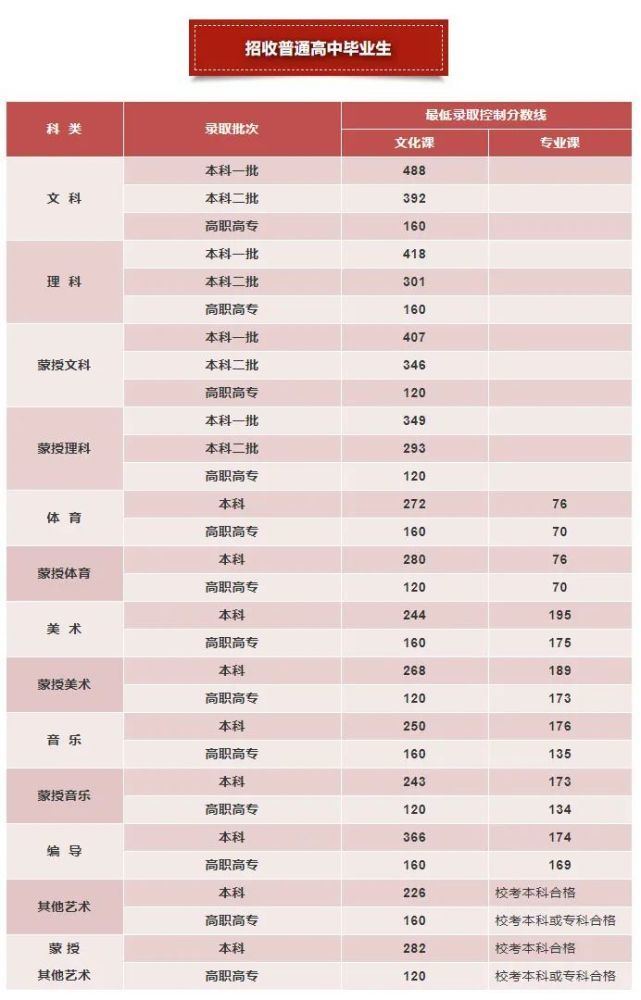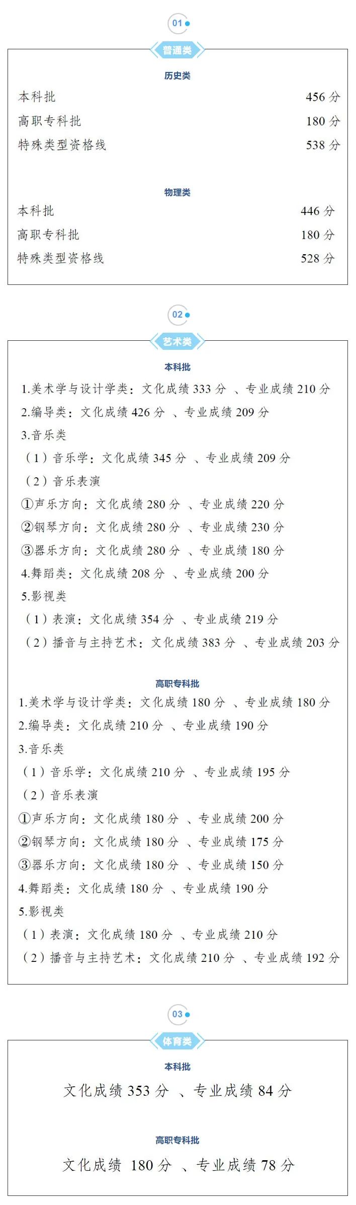 文科文化课为265分,理科文化课为210分。艺术类本科全省统考专业课最低录取控制分数线,将于艺术类提前批次录取后划定发布。