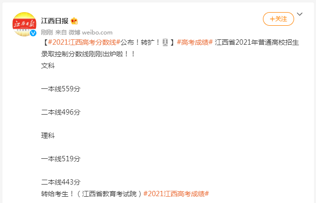 2021年江西高考分数线公布!文科二本496分,理科二本443分