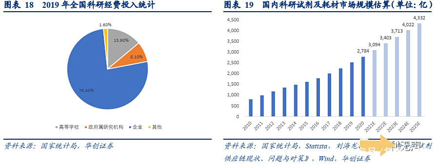 由此得出,2020年,国内科研试剂、耗材市场总规模约为2784亿。根据Statista的预测,2025年中国GDP将达到135.71万亿元,届时如果R&D经费占比提升至2.8%,那么中国的的科研试剂、耗材市场规模将超过4000亿,也就是说5年接近翻倍的增量空间。