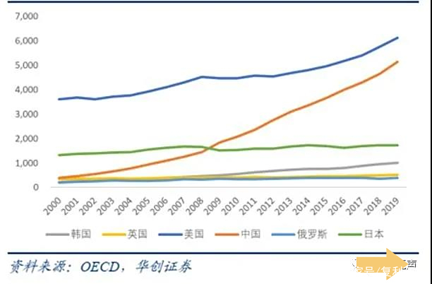 近20年我国研发投入增速位列全球第一(亿美元)
