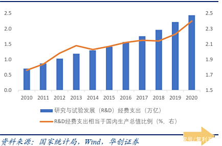 尤其是2018年以来,我国R&D经费支出占GDP比重逐年明显加速提升,到2020年R&D经费支出达24,426亿元,比上年增长10.3%,占GDP的2.4%。目前我国R&D经费总额位列全球第二,仅次于莓果。
