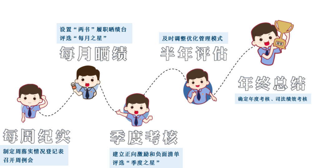 改变以往“年底算总账”的做法,强调“功夫需下在平时”,建立“全时段考核管理模式”。通过“每周记实、每月晒绩、季度考核、半年评估、年终总结”的及时性总体性反馈方式,让考核真正考出差距、拉开等次,扎实推动“两书”管理制度落地见效。