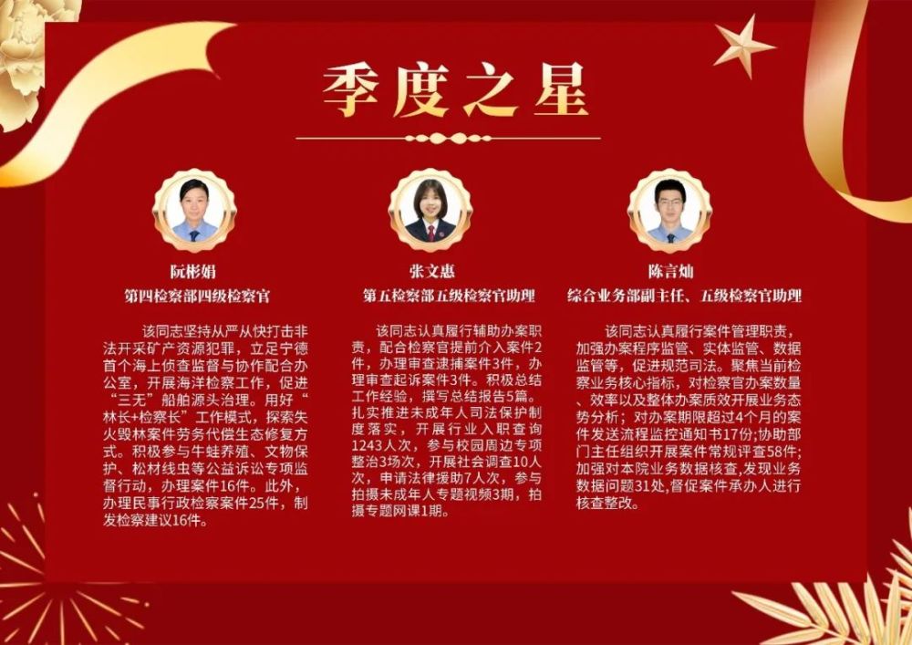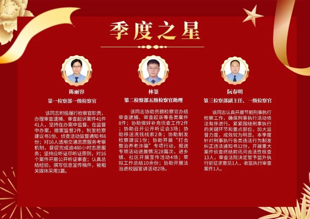 作为集中办理醉驾案件的检察官,该院第一检察部的陈丽容在平时考核中两度获评“好”等次及“季度之星”。“考核带来的不仅是压力,也是动力。”今年以来,她共办理危险驾驶案件141件,发出《侦查活动监督通知书》12份,自行补充侦查12件,监督撤案5件,对40人适用交通志愿服务考察机制,对29名犯罪嫌疑人开展拟不起诉公开审查听证,不起诉37人,用心办好群众身边的每一个“小案”。她还对办案中发现的问题进行收集研判、分析整合,开展类案监督,向公安机关发出检察建议。而她的岗位职责落实情况及工作业绩也通过考核得分客观反映出来,得分位居同一业务条线检察官前列。