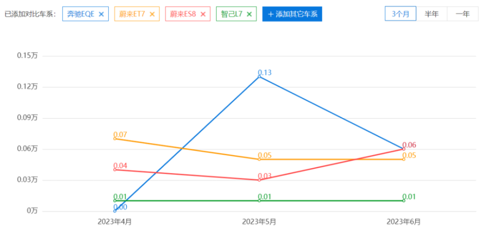 EQE SUV指导价为48.60-63.06万元,算上优惠落地也在45万以上,上市首月销量便达到1533辆。在这个区间,除了理想L系列的增程式车型,还没有月销过千的选手。EQE的竞品则是耳熟能详的蔚来ET7、智己L7等等,销量已然实现反超。