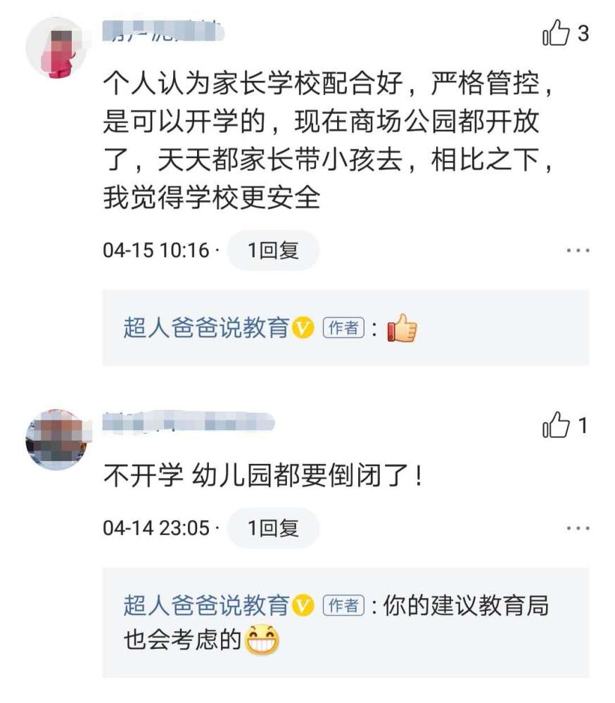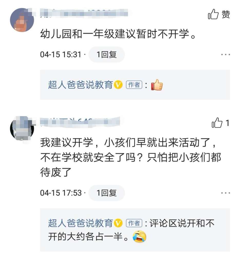 对此,前两天笔者(超人爸爸说教育)发了个短内容,在评论区里,支持开学和支持不开学的,大约各占一半。