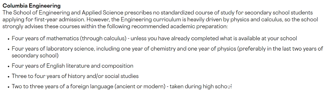 刚我们列举了哥伦比亚本科文理学院的招生要求,这里我们看一下工程学院录取的高中课程要求。可以明确的看出,哥大工程学院强调物理和微积分,数学难度增大,而且对于理科完成的时间有时间建议,文理学院建议3-4年,工程学院建议直接上完4年;而第二外语的时间也相应减少了一年的建议。