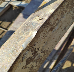 该汽车起重机主吊钩(大钩走四线)钢丝绳(4×37-φ14)断裂,断裂位置离大臂顶端(钢丝绳死头位置)约1.75m,断裂钢丝绳的钢丝有缩颈(拉伸断裂前变形)情况。大钩落在地面,大钩顶端和滑车组上有挤碰痕迹(图4、5),大钩及滑车组重量约300kg,大钩不工作时停留在离大臂顶端约0.5m位置。大臂顶端及地面未见大钩高度限位器。