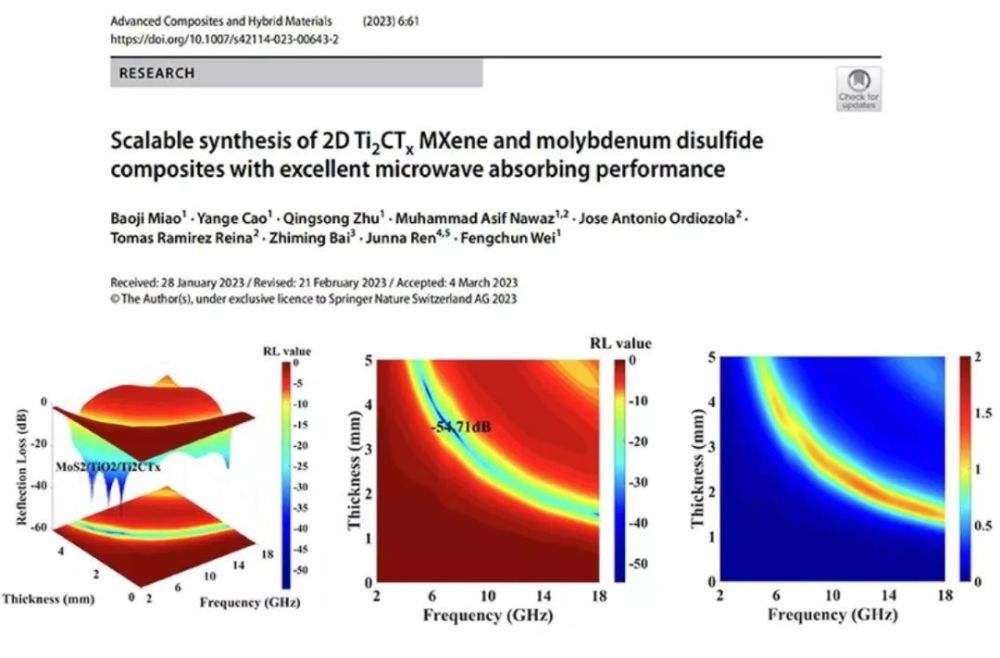 近日,我校材料科学与工程学院河南省纳米光电磁国际联合实验室与西班牙“塞维利亚无机化学与材料科学研究所”和北京航空航天大学合作在国际知名学术期刊Advanced Composites and Hybrid Materials(即时 IF=19.155)上发表了题为“Scalable synthesis of 2D Ti2CTxMXene and molybdenum disulfide composites with excellent microwave absorbing performance”(DOI: 10.1007/s42114-023-00643-2)的研究论文。苗保记博士及其所指导研究生曹燕格为共同第一作者,朱青松博士和Muhammad Asif博士后为共同通讯作者,河南工业大学为论文第一署名和通讯作者单位。