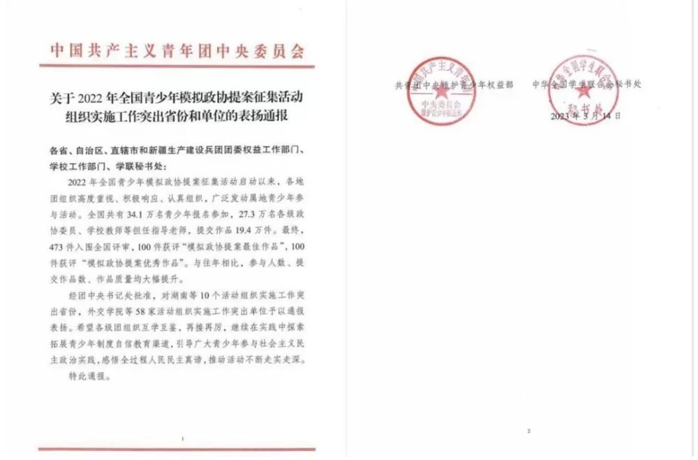 我校喜获全国青少年模拟政协提案征集活动组织实施工作突出单位通报表扬