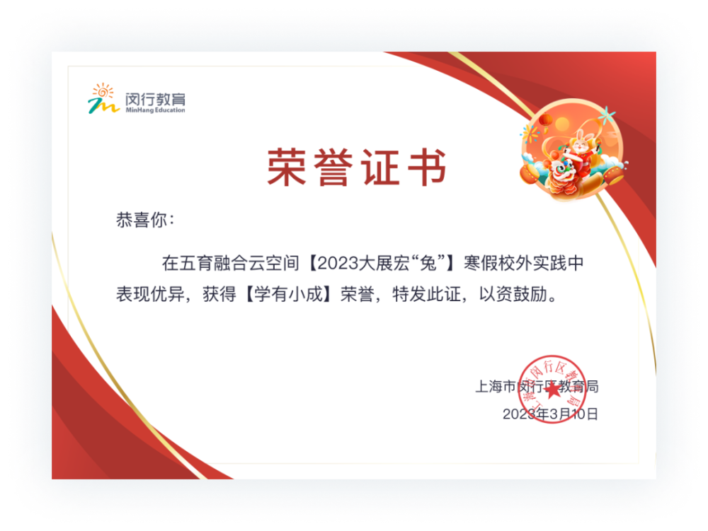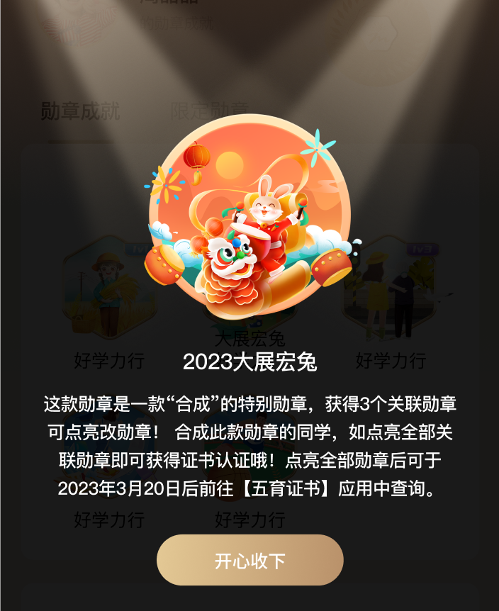 获得合成勋章「2023大展宏兔」的同学,可以登录“五育证书”领取你的永久荣誉证书啦!(获得的勋章个数不同,证书的荣誉等级也不同哦)