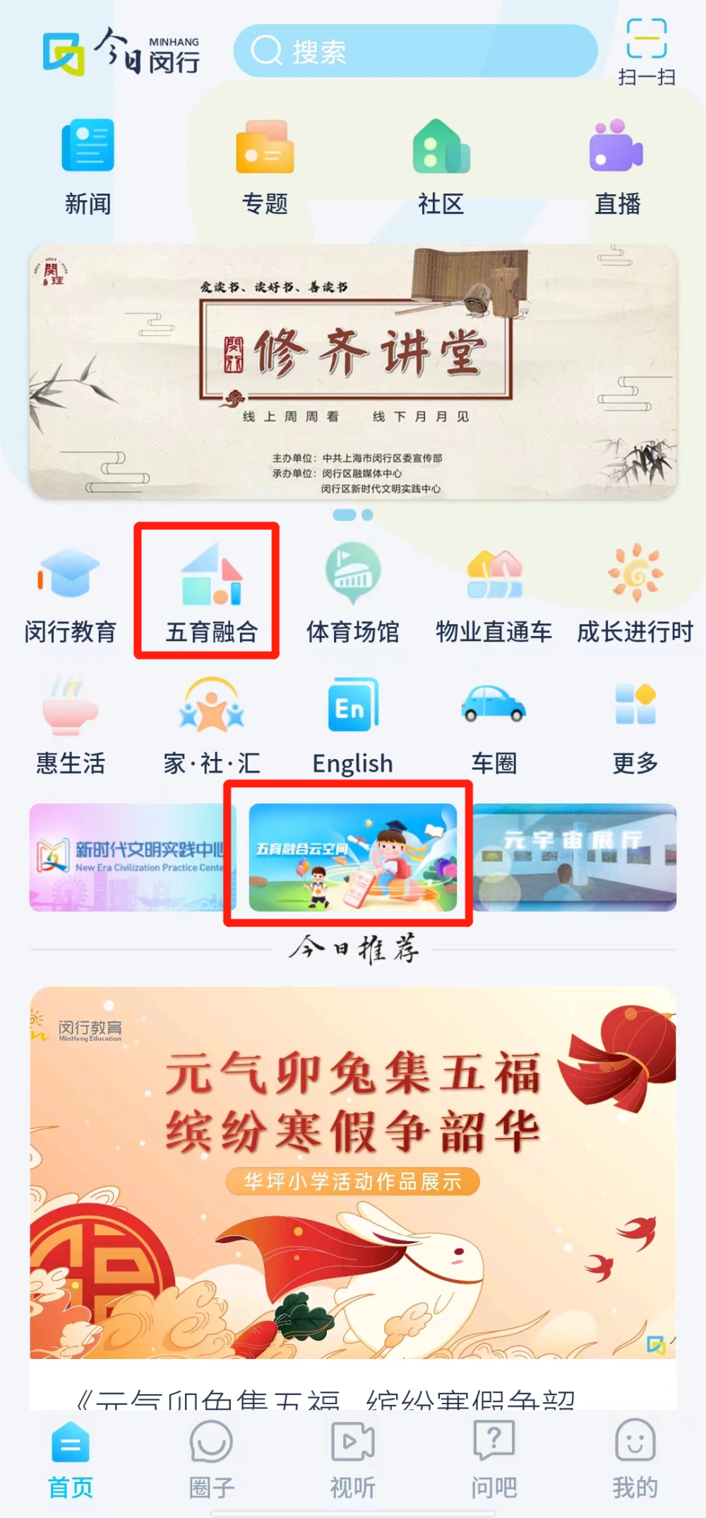 登录方式:下载今日闵行APP,搜索“五育融合”,点击图片进入“五育融合云空间”