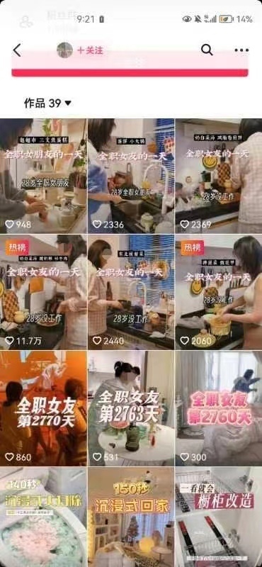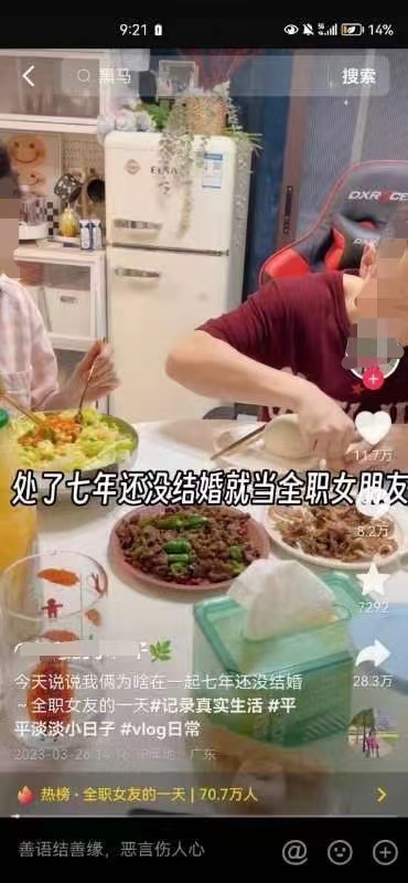 3月29日,华商报大风新闻记者在该女子的社交平台看到,其简介称“28岁没工作,全职女友生活日记,恋爱7年未婚同居,学习经营小家”。今年3月起,该女子以视频形式记录全职女友的一天,每天上午十点准备早午餐,下午六点半开始做晚饭。对于网友关心的“为什么在一起7年了还不结婚”“被辞退了以后怎么生存”等问题,女子也都做出回应。