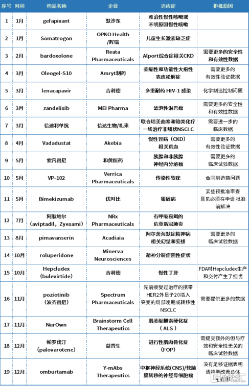 2022年FDA拒绝批准的药物,资料来源:公开资料(不完全统计)