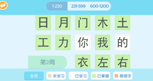 熊猫博士识字App中包含1200个常用汉字,并且分为3个阶段:1-200,201-600,601-1200个,是按照在教材里出现的先后顺序和难易程度划分的。随着基础汉字的掌握,每个阶段的要学习的汉字字数逐渐递增。