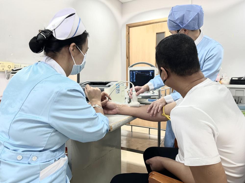 刚给张女士做完耳穴贴压的治疗,另一名铁粉又找上护理门诊。由于肾功能的情况不容乐观,经过评估,刘先生需要做血液透析。他听从黄护士长的建议,准备做动静脉内瘘术。黄护士长和李燕专科护士借助B超仪器,检查了他的血管,在手臂上画穿刺示意图,并把动静脉内瘘的穿刺过程和透析注意事项详细讲述给他听。“因为整个动静脉内瘘是血液透析患者的生命线,提前做好准备,画好图,存好档,一旦需要血透,我们就可以按规划立即启用,不用临时应急插透析导管透析。尽最大可能确保他的安全,并保护他的血管。”