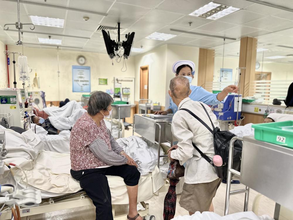 在血液透析中心,记者也看到不少相濡以沫,相互扶持的夫妻。12点30分,77岁的刘婆婆刚透析完,85岁阿公迈着蹒跚的步子推着轮椅来接她。“每次都是阿伯推着轮椅来接阿婆。他很贴心地照顾阿婆。”周围的护士小哥对阿伯也是赞不绝口。