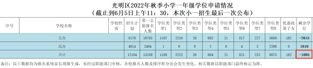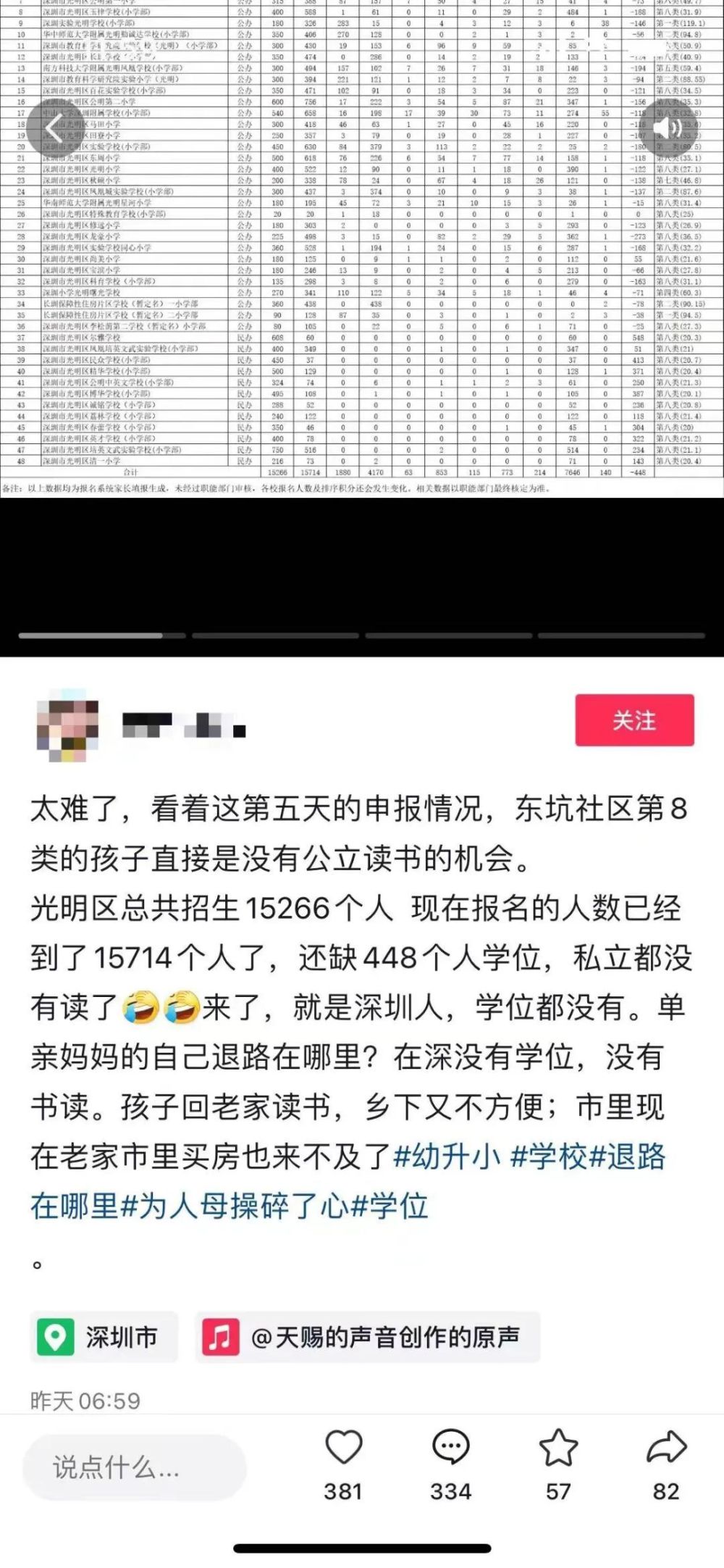 截止昨天(6月6日下午5点),光明区内35所小学学位爆仓,18所初中学位爆仓,几乎所有公办剩余学位清0。