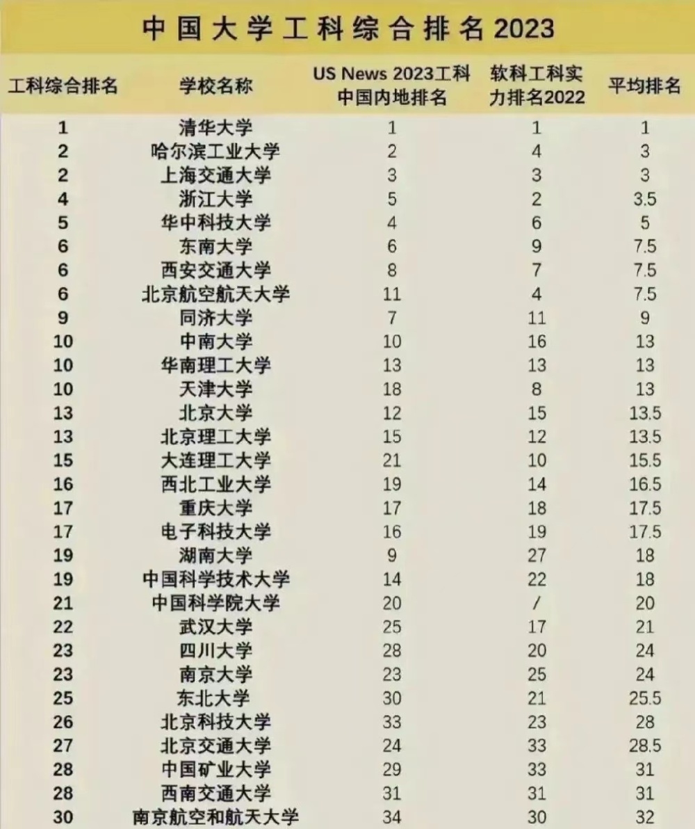 哈尔滨工业大学表现突出,以U.S.News世界大学工科排行榜中国内地高校排名第二位,软科中国内地高校工科实力排名第四位,内地高校平均排名全国第二位。