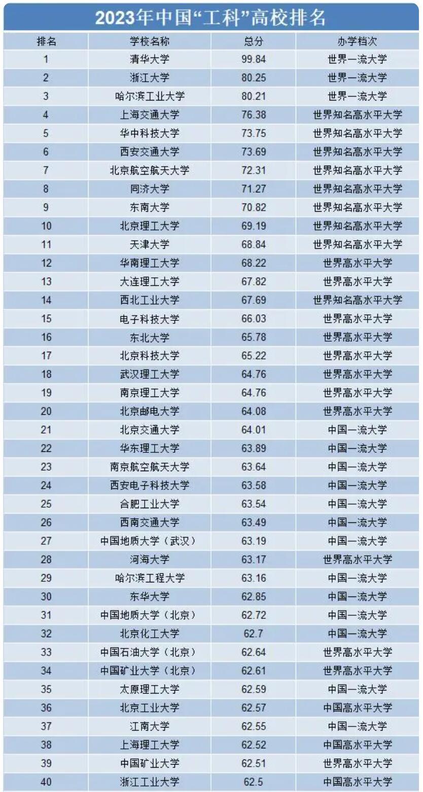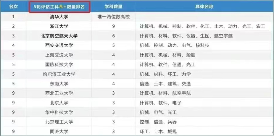 从新一轮全国高校学科评估的角度看,似乎更能够说明问题。譬如:A+类学科数量,清华大学超过了10个,浙江大学共有9个,北京航空航天大学共有8个,以上三所高校是工科实力当仁不让的强校。