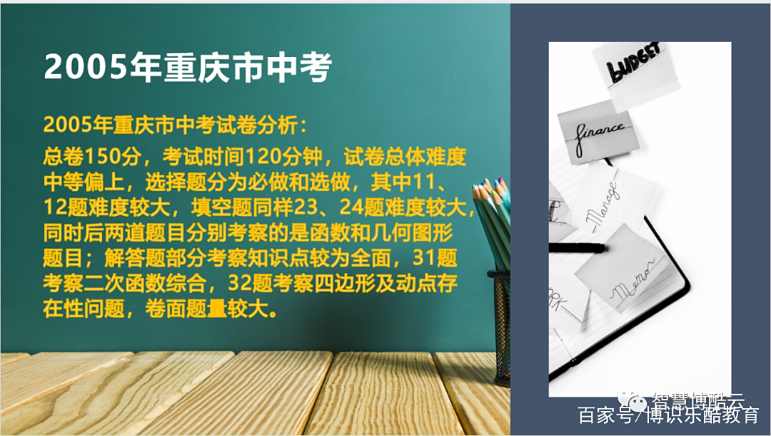 2005年重庆市中考数学试卷分析:全卷共三大题,满分150分,考试时间120分钟,第一大题选择题12道题共计48分,从知识考察方向看数与代数部分有3题,方程与不等式没有考察,函数考察4题,几何图形有5题;第二大题填空题12题,共计36分,考察知识分布来看,数与代数有3题,方程与不等式有2题,函数有1题,几何图形有5题,图形规律题有1题;第三大题解答25题考察实数运算和分式运算,26题考察平行四边形,27题考察统计知识;28题考察一次函数的应用;29题考察二元一次方程组的应用;30题考察考察圆的综合题;31题考察二次函数综合题;32题考察四边形综合题。