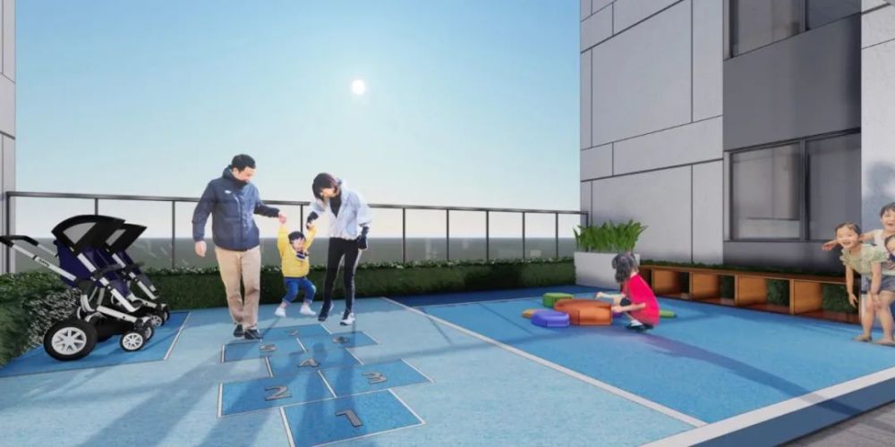 纯水岸让绿意向上生长,在高层建筑中每隔四层增设一个空中花园,规划为儿童活动区、运动健身区、心灵休憩区三大主题,为居者提供半室外的“第二会客厅”。