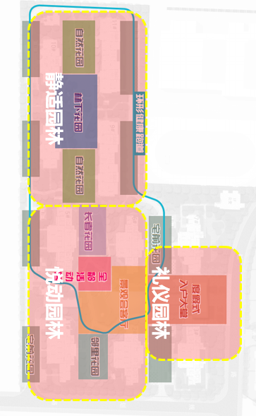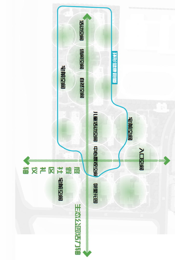 以650m健康跑道贯穿整个住区园林,社区礼仪轴、生态活力轴交会,礼仪园林、悦动园林、静适园林三大多元场景,让每一位业主皆能玩有所乐。