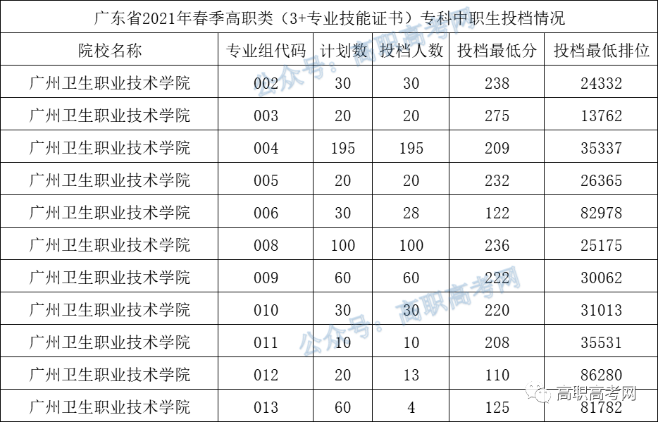 广州卫生的专业组分的很细,006/012/013这3个组的分数比较低,填的同学并不多。其他专业最低排位在1.3~3.5万左右。